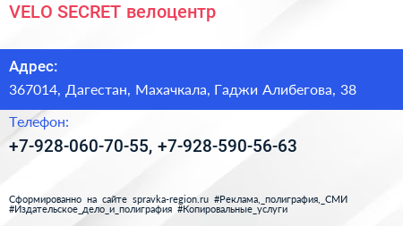 VELO SECRET, велоцентр по адресу 367014, Дагестан, Махачкала, Гаджи Алибегова, 38 в дальнейшем Организация, размещена в следующих категориях: