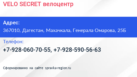 VELO SECRET, велоцентр по адресу 367010, Дагестан, Махачкала, Генерала Омарова, 25Б в дальнейшем Организация, размещена в следующих категориях: