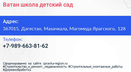 Ватан, школа-детский сад по адресу 367015, Дагестан, Махачкала, Магомеда Ярагского, 128 в дальнейшем Организация, размещена в следующих категориях: