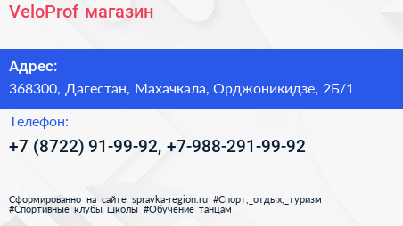VeloProf, магазин по адресу 368300, Дагестан, Махачкала, Орджоникидзе, 2Б/1 в дальнейшем Организация, размещена в следующих категориях: