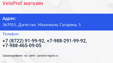 VeloProf, магазин по адресу 367015, Дагестан, Махачкала, Гагарина, 5 в дальнейшем Организация, размещена в следующих категориях:
