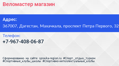 Веломастер, магазин по адресу 367007, Дагестан, Махачкала, проспект Петра Первого, 32 в дальнейшем Организация, размещена в следующих категориях: