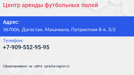 Центр аренды футбольных полей по адресу 367006, Дагестан, Махачкала, Патриотная 8-я, 3/2 в дальнейшем Организация, размещена в следующих категориях: