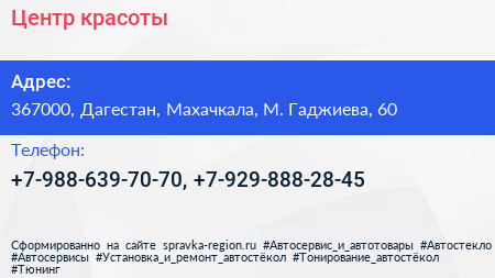 Центр красоты по адресу 367000, Дагестан, Махачкала, М. Гаджиева, 60 в дальнейшем Организация, размещена в следующих категориях: