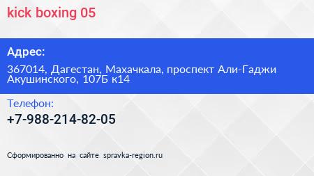 kick boxing 05 по адресу 367014, Дагестан, Махачкала, проспект Али-Гаджи Акушинского, 107Б к14 в дальнейшем Организация, размещена в следующих категориях: