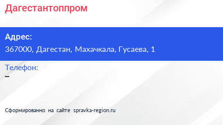 Дагестантоппром по адресу 367000, Дагестан, Махачкала, Гусаева, 1 в дальнейшем Организация, размещена в следующих категориях: