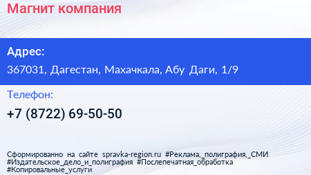 Магнит, компания по адресу 367031, Дагестан, Махачкала, Абу Даги, 1/9 в дальнейшем Организация, размещена в следующих категориях: