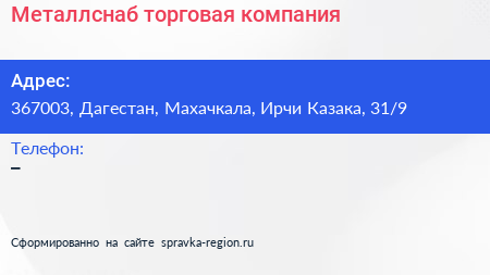 Металлснаб, торговая компания по адресу 367003, Дагестан, Махачкала, Ирчи Казака, 31/9 в дальнейшем Организация, размещена в следующих категориях: