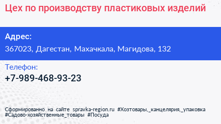 Цех по производству пластиковых изделий по адресу 367023, Дагестан, Махачкала, Магидова, 132 в дальнейшем Организация, размещена в следующих категориях: