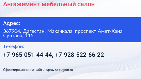 Ангажемент, мебельный салон по адресу 367904, Дагестан, Махачкала, проспект Амет-Хана Султана, 115 в дальнейшем Организация, размещена в следующих категориях:
