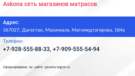 Askona, сеть магазинов матрасов по адресу 367027, Дагестан, Махачкала, Магомедтагирова, 184а в дальнейшем Организация, размещена в следующих категориях: