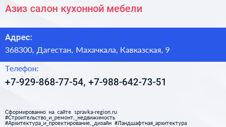 Азиз, салон кухонной мебели по адресу 368300, Дагестан, Махачкала, Кавказская, 9 в дальнейшем Организация, размещена в следующих категориях: