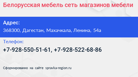 Белорусская мебель, сеть магазинов мебели по адресу 368300, Дагестан, Махачкала, Ленина, 54а в дальнейшем Организация, размещена в следующих категориях: