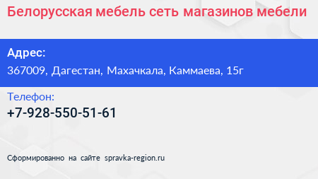 Белорусская мебель, сеть магазинов мебели по адресу 367009, Дагестан, Махачкала, Каммаева, 15г в дальнейшем Организация, размещена в следующих категориях: