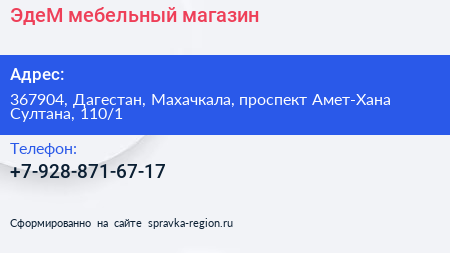ЭдеМ, мебельный магазин по адресу 367904, Дагестан, Махачкала, проспект Амет-Хана Султана, 110/1 в дальнейшем Организация, размещена в следующих категориях:
