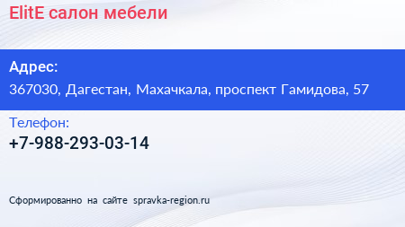 ElitE, салон мебели по адресу 367030, Дагестан, Махачкала, проспект Гамидова, 57 в дальнейшем Организация, размещена в следующих категориях: