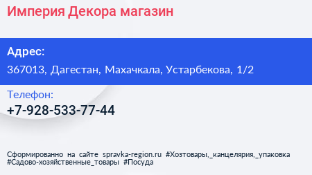 Империя Декора, магазин по адресу 367013, Дагестан, Махачкала, Устарбекова, 1/2 в дальнейшем Организация, размещена в следующих категориях: