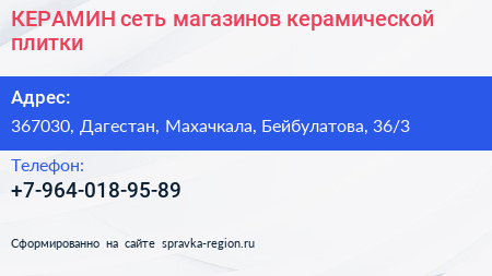 КЕРАМИН, сеть магазинов керамической плитки по адресу 367030, Дагестан, Махачкала, Бейбулатова, 36/3 в дальнейшем Организация, размещена в следующих категориях: