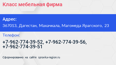 Класс, мебельная фирма по адресу 367013, Дагестан, Махачкала, Магомеда Ярагского, 23 в дальнейшем Организация, размещена в следующих категориях: