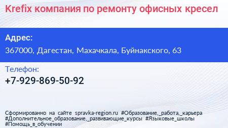 Krefix, компания по ремонту офисных кресел по адресу 367000, Дагестан, Махачкала, Буйнакского, 63 в дальнейшем Организация, размещена в следующих категориях: