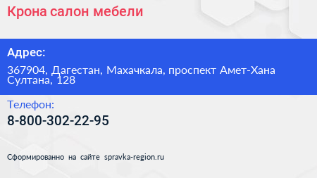 Крона, салон мебели по адресу 367904, Дагестан, Махачкала, проспект Амет-Хана Султана, 128 в дальнейшем Организация, размещена в следующих категориях: