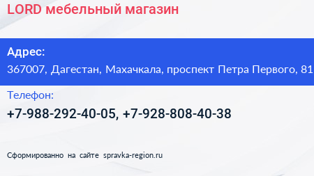LORD, мебельный магазин по адресу 367007, Дагестан, Махачкала, проспект Петра Первого, 81 в дальнейшем Организация, размещена в следующих категориях: