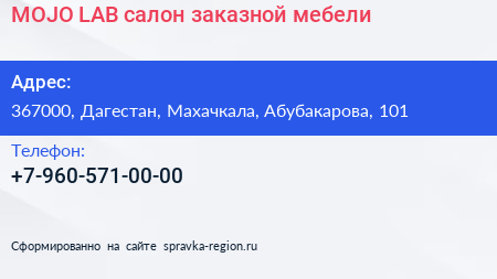 MOJO LAB, салон заказной мебели по адресу 367000, Дагестан, Махачкала, Абубакарова, 101 в дальнейшем Организация, размещена в следующих категориях: