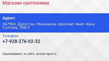 Магазин сантехники по адресу 367904, Дагестан, Махачкала, проспект Амет-Хана Султана, 208/1 в дальнейшем Организация, размещена в следующих категориях:
