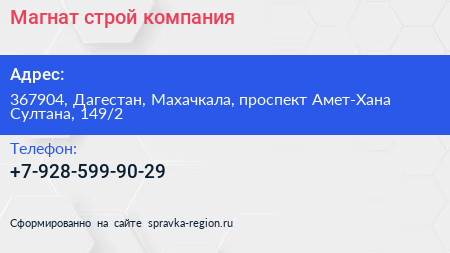 Магнат строй, компания по адресу 367904, Дагестан, Махачкала, проспект Амет-Хана Султана, 149/2 в дальнейшем Организация, размещена в следующих категориях: