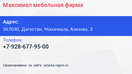 Максимал, мебельная фирма по адресу 367030, Дагестан, Махачкала, Азизова, 2 в дальнейшем Организация, размещена в следующих категориях:
