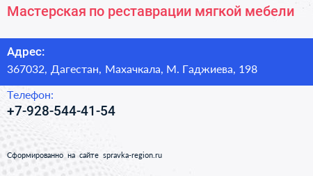 Мастерская по реставрации мягкой мебели по адресу 367032, Дагестан, Махачкала, М. Гаджиева, 198 в дальнейшем Организация, размещена в следующих категориях: