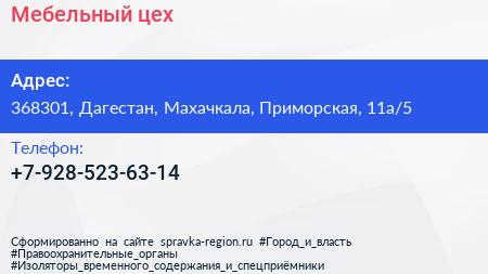 Мебельный цех по адресу 368301, Дагестан, Махачкала, Приморская, 11а/5 в дальнейшем Организация, размещена в следующих категориях: