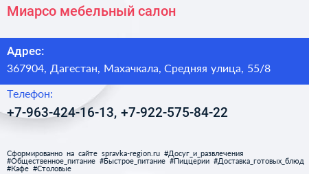 Миарсо, мебельный салон по адресу 367904, Дагестан, Махачкала, Средняя улица, 55/8 в дальнейшем Организация, размещена в следующих категориях: