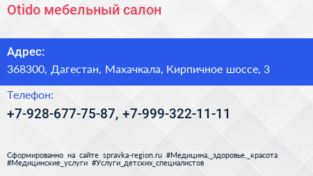 Otido, мебельный салон по адресу 368300, Дагестан, Махачкала, Кирпичное шоссе, 3 в дальнейшем Организация, размещена в следующих категориях: