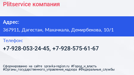 Plitservice, компания по адресу 367911, Дагестан, Махачкала, Демирбекова, 10/1 в дальнейшем Организация, размещена в следующих категориях: