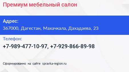 Премиум, мебельный салон по адресу 367000, Дагестан, Махачкала, Дахадаева, 23 в дальнейшем Организация, размещена в следующих категориях: