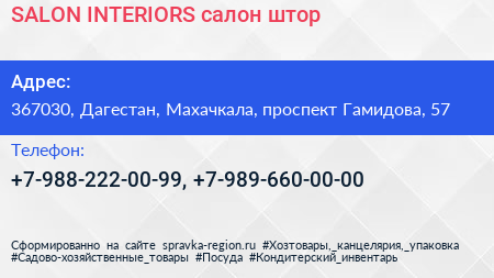 SALON INTERIORS, салон штор по адресу 367030, Дагестан, Махачкала, проспект Гамидова, 57 в дальнейшем Организация, размещена в следующих категориях:
