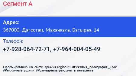 Сегмент-А по адресу 367000, Дагестан, Махачкала, Батырая, 14 в дальнейшем Организация, размещена в следующих категориях: