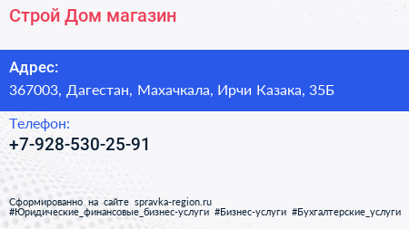 Строй Дом, магазин по адресу 367003, Дагестан, Махачкала, Ирчи Казака, 35Б в дальнейшем Организация, размещена в следующих категориях: