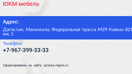 ЮКМ мебель по адресу Дагестан, Махачкала, Федеральная трасса М29 Кавказ 821 км, 1 в дальнейшем Организация, размещена в следующих категориях: