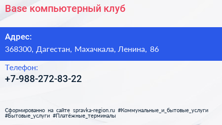 Base, компьютерный клуб по адресу 368300, Дагестан, Махачкала, Ленина, 86 в дальнейшем Организация, размещена в следующих категориях: