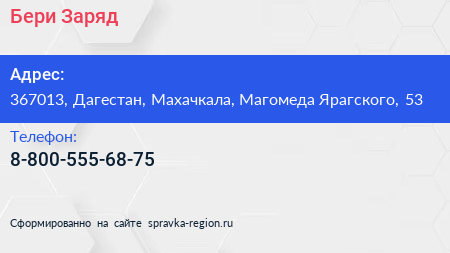 Бери Заряд по адресу 367013, Дагестан, Махачкала, Магомеда Ярагского, 53 в дальнейшем Организация, размещена в следующих категориях: