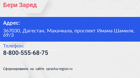 Бери Заряд по адресу 367030, Дагестан, Махачкала, проспект Имама Шамиля, 69/3 в дальнейшем Организация, размещена в следующих категориях: