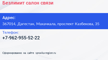 Безлимит, салон связи по адресу 367014, Дагестан, Махачкала, проспект Казбекова, 35 в дальнейшем Организация, размещена в следующих категориях: