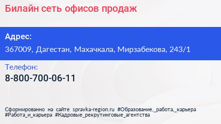 Билайн, сеть офисов продаж по адресу 367009, Дагестан, Махачкала, Мирзабекова, 243/1 в дальнейшем Организация, размещена в следующих категориях: