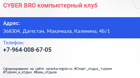 CYBER BRO, компьютерный клуб по адресу 368304, Дагестан, Махачкала, Калинина, 4Б/1 в дальнейшем Организация, размещена в следующих категориях: