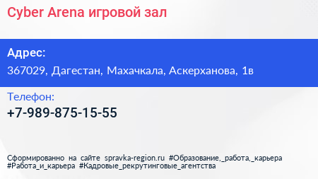 Cyber Arena, игровой зал по адресу 367029, Дагестан, Махачкала, Аскерханова, 1в в дальнейшем Организация, размещена в следующих категориях: