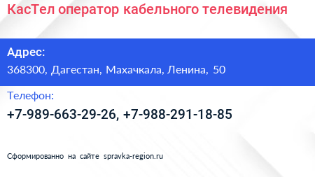 КасТел, оператор кабельного телевидения по адресу 368300, Дагестан, Махачкала, Ленина, 50 в дальнейшем Организация, размещена в следующих категориях: