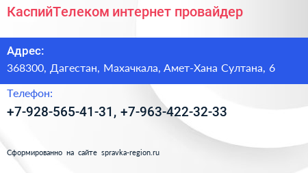 КаспийТелеком, интернет-провайдер по адресу 368300, Дагестан, Махачкала, Амет-Хана Султана, 6 в дальнейшем Организация, размещена в следующих категориях: