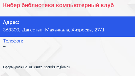Кибер библиотека, компьютерный клуб по адресу 368300, Дагестан, Махачкала, Хизроева, 27/1 в дальнейшем Организация, размещена в следующих категориях:
